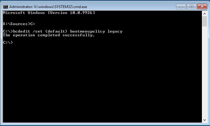 - Once the first commend executes successfully, type BCDEDIT /SET {DEFAULT} BOOTMENUPOLICY LEGACY command and press Enter.