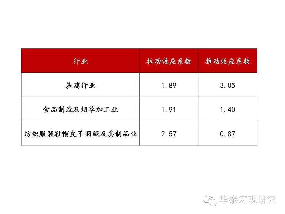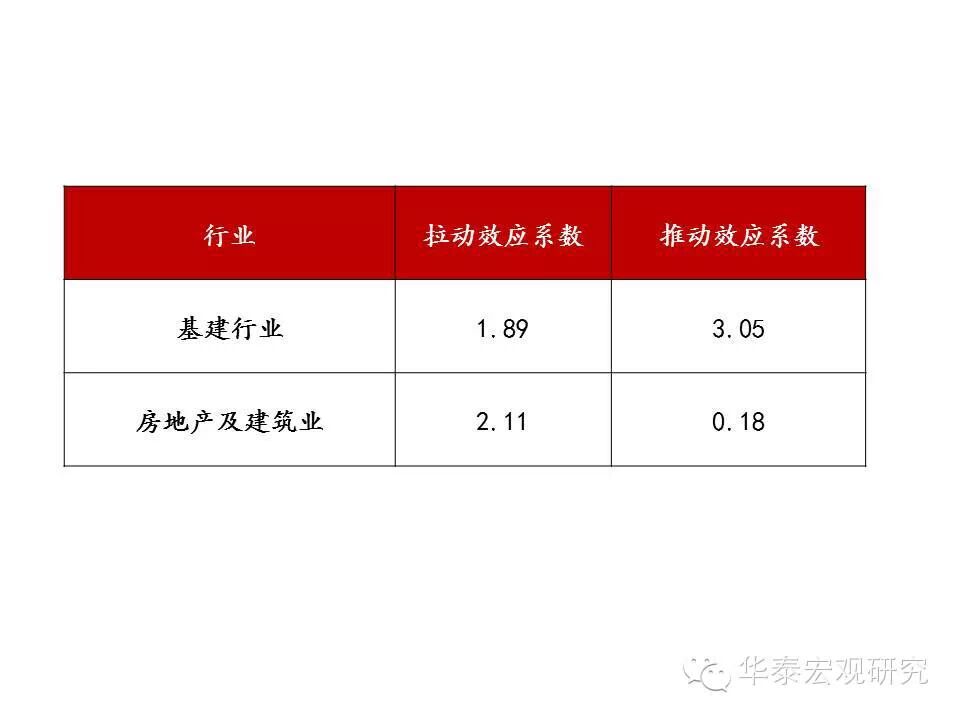 投入产出表的系数分析为我们提供了某行业对其上游行业的总需求的拉动效应和对其下游行业的总供给的推动效应的测量方法。经过仔细计算,我们获得了各行业的完全消耗系数(拉动效应)和完全分配系数(推动效应)。下表列出了基建行业和房地产建筑业两个大行业的系数。其中,与基建相关行业有6个(电力、热力的生产和供应业,燃气生产和供应业,水的生产和供应业,交通运输及仓储业,邮政业,水利、环境和公共设施管理业),与房地产建筑业相关的行业有两个(房地产业,建筑业)。