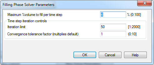 Example: If 100 "Number of intermediate results in filling phase" are required, but 4% is still entered for “Maximum %volume to fill per time step”, the solver cannot include 100 time steps for filling, but in fact closer to 25 time step. In order to achieve 100 "Number of intermediate results in filling phase", the “Maximum %volume to fill per time step" should be adjusted to 1%